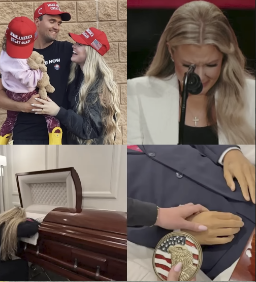 At his funeral, Erika clutched their daughters tightly as she whispered goodbye. Cameras captured the moment her trembling hand rested on the polished wood of his casket, her tears soaking the flag folded beside it. It wasn’t just a farewell — it was the breaking of something sacred.