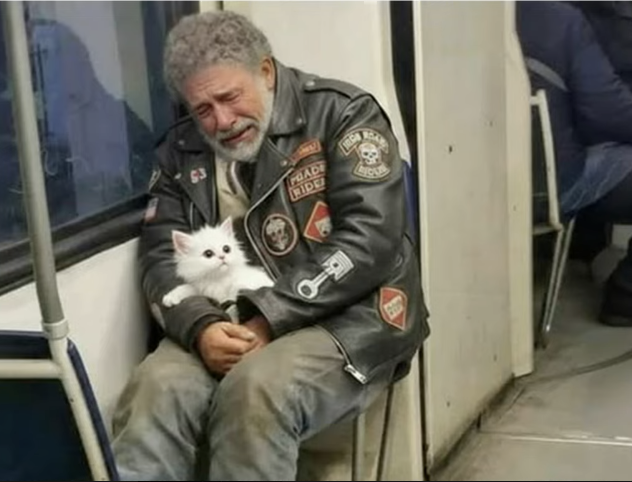 He was sixty-five, his leather jacket worn thin, his eyes weary from years of riding nowhere. On the subway that morning, people avoided his gaze. He looked like any other man who’d been forgotten by time. But in his arms, wrapped in a trembling bundle of orange fur, was something small, fragile—and alive.