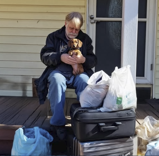 When I arrived that afternoon to surprise him, the sight broke me. There he was — sitting on the porch, suitcase beside him, Penny trembling in his lap. He wasn’t angry. Just quiet. Defeated in the way only gentle souls can be when they’ve been hurt too much.